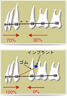 しかし、インプラント矯正の場合、「インプラントでしっかり固定されたスクリューを支点」にするので、動かしたい歯を引っ張ると、その歯だけがスムーズに移動してくれるため、力が分散されず治療期間が短くなります。