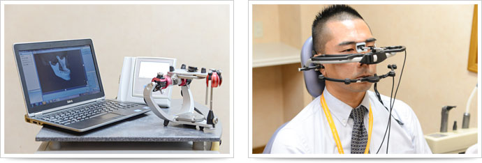 この機器の特徴として、患者様にヘッドフレームを装着することで、人の感覚では分からない顎の細かい動きを分析することができます。さらに、モニタ上で顎の動きをリアルタイムで見ることが出来ますので、患者様にも分かりやすく説明することができます。